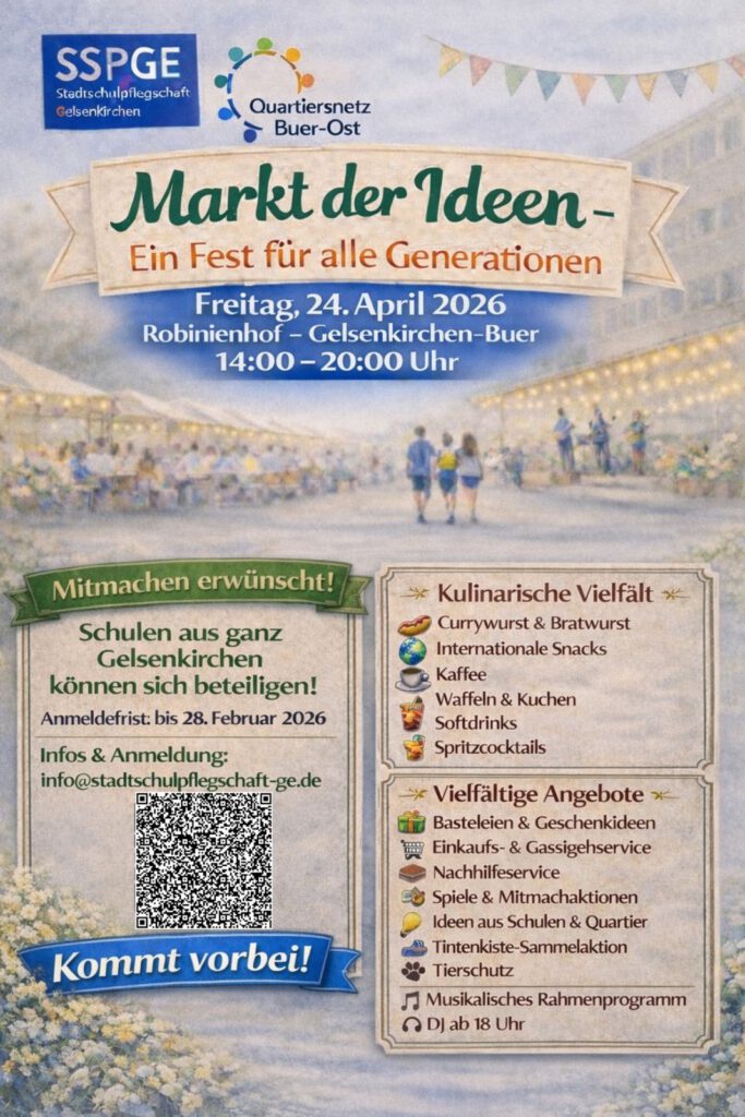 Am Freitag, den 24. April 2026, verwandelt sich der Robinienhof in Gelsenkirchen‑Buer von 14:00 bis 20:00 Uhr in einen lebendigen Ort voller Kreativität, Begegnung und Austausch. Gemeinsam mit der Stadtschulpflegschaft Gelsenkirchen lädt das Quartiersnetz Buer‑Ost alle Schulen der Stadt herzlich dazu ein, Teil dieses besonderen Tages zu werden.